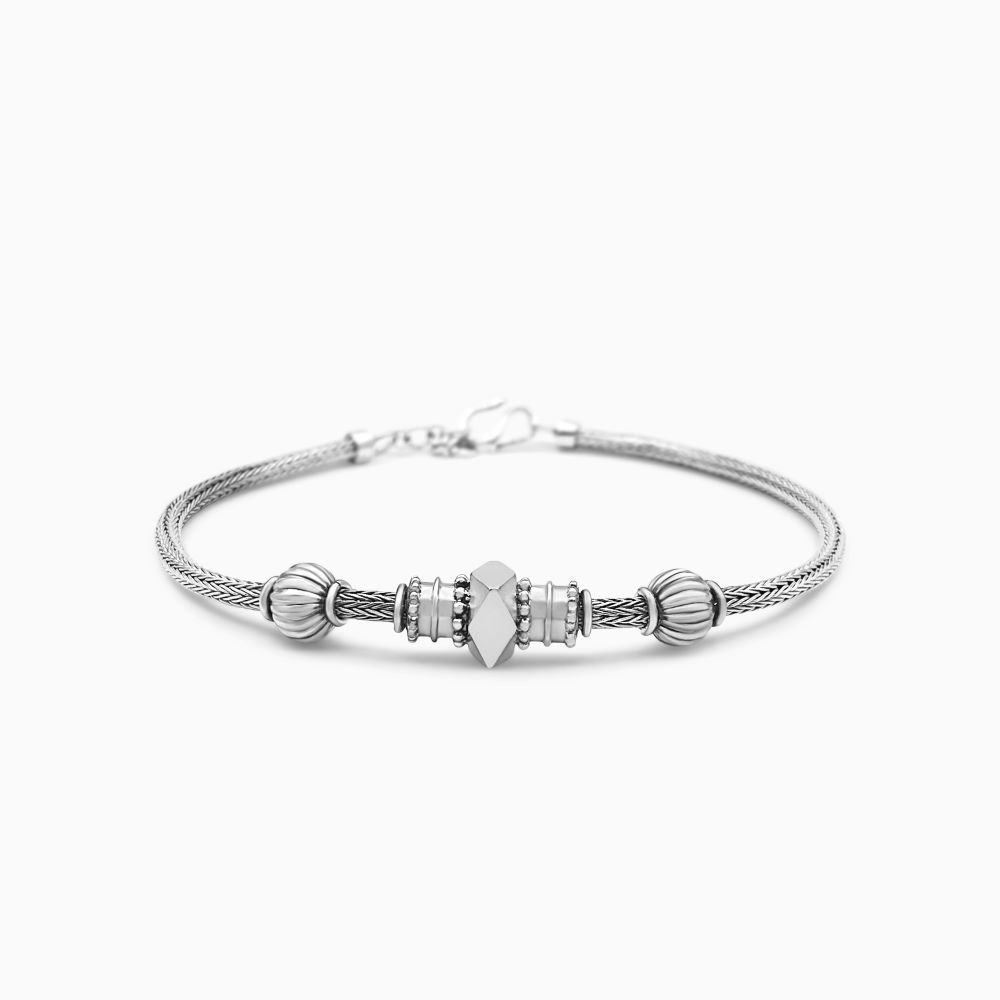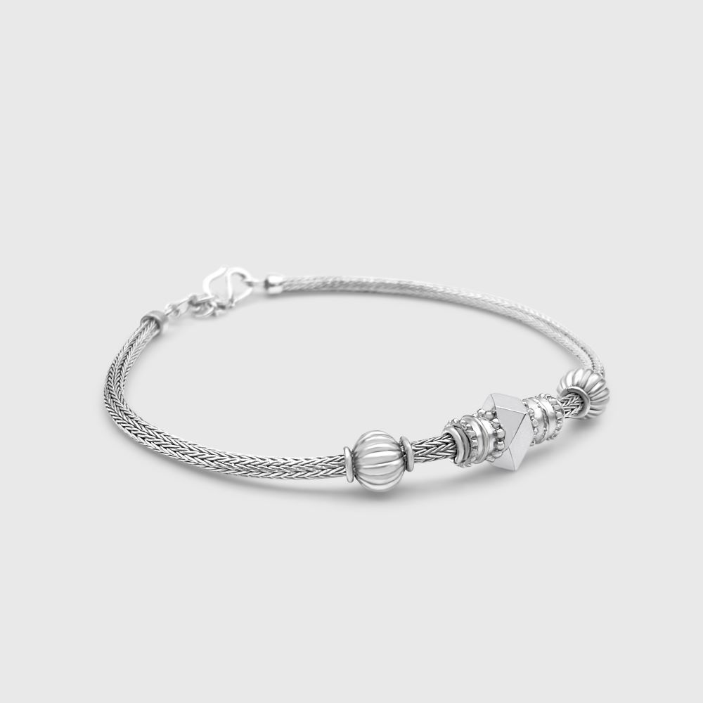 A textured band that’s weaved in sterling silver, a scroll connector on one side and its combination on the other.