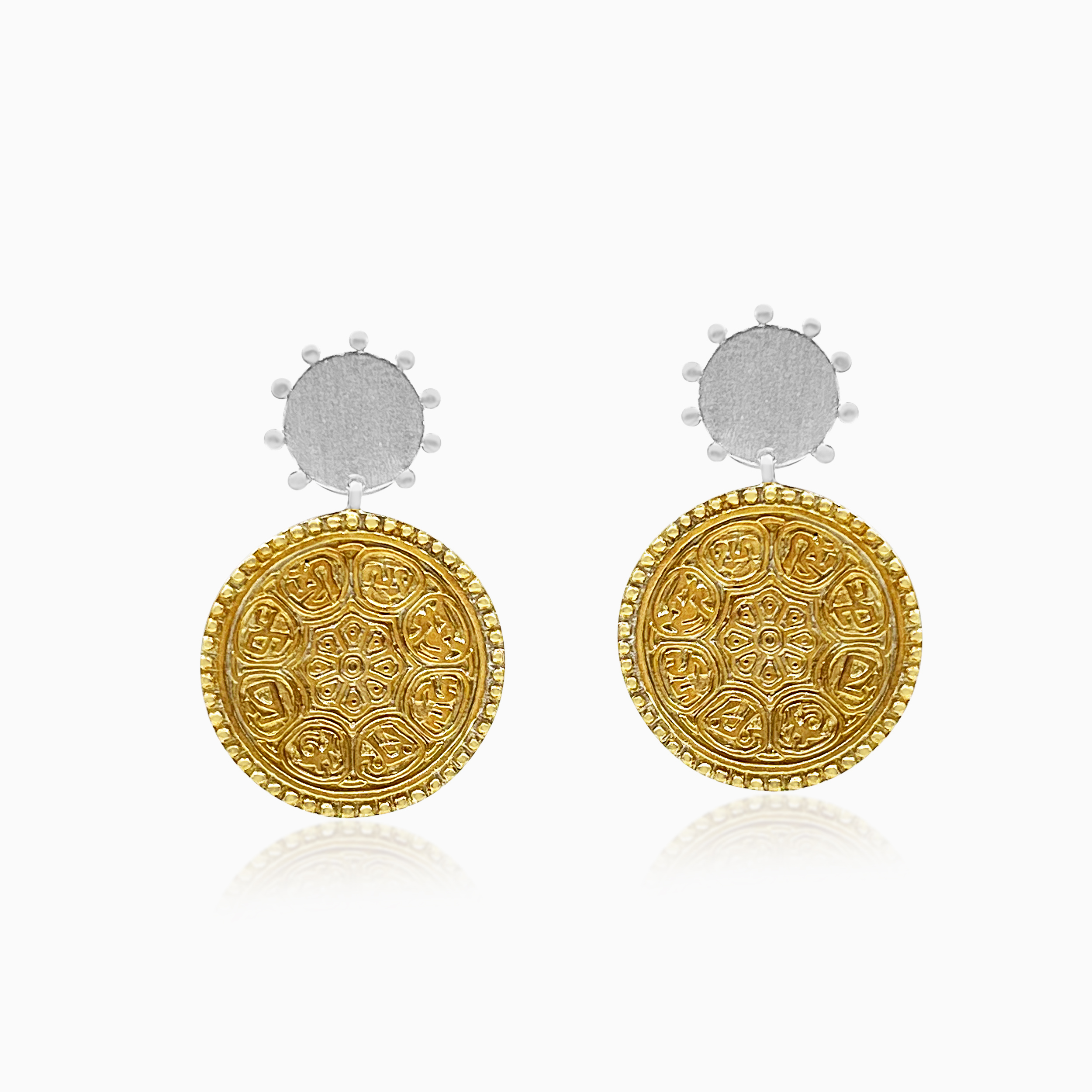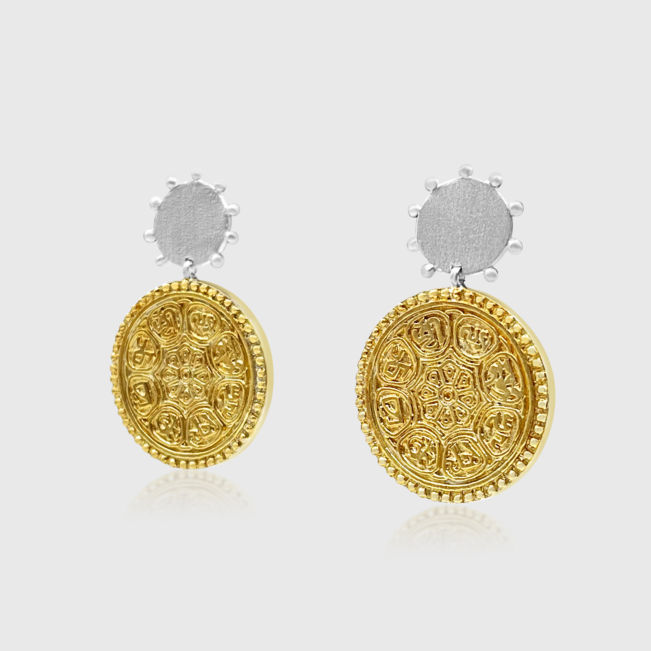 Inspired by ancient coins, these earrings blend intricate detailing with a golden touch for a look of vintage elegance.