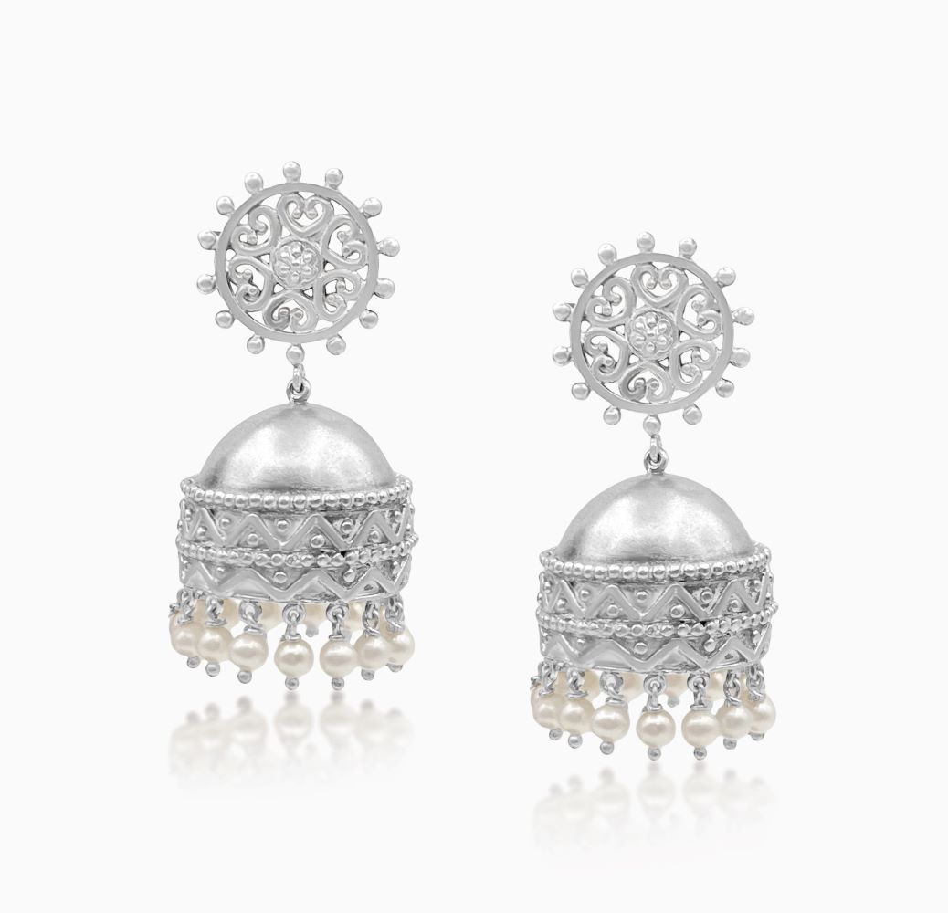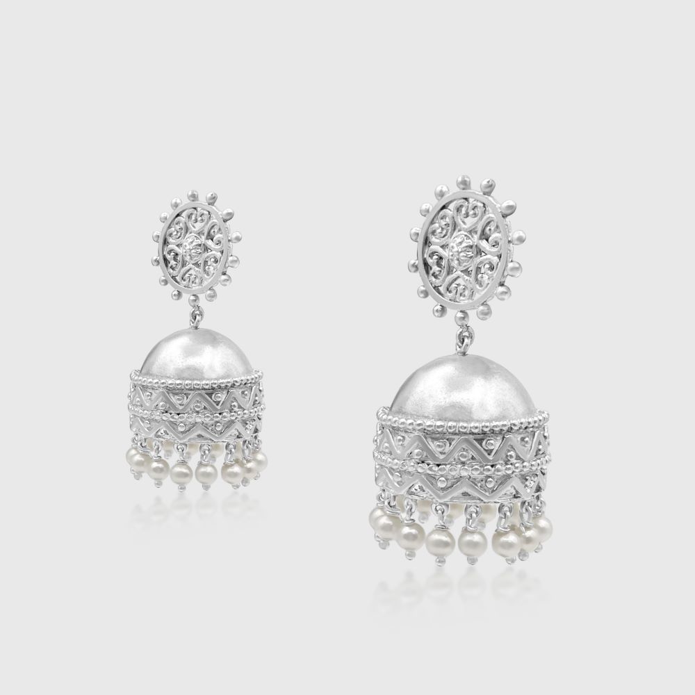 Intricate sterling silver jhumkas with delicate pearl drops timeless elegance in every sway.