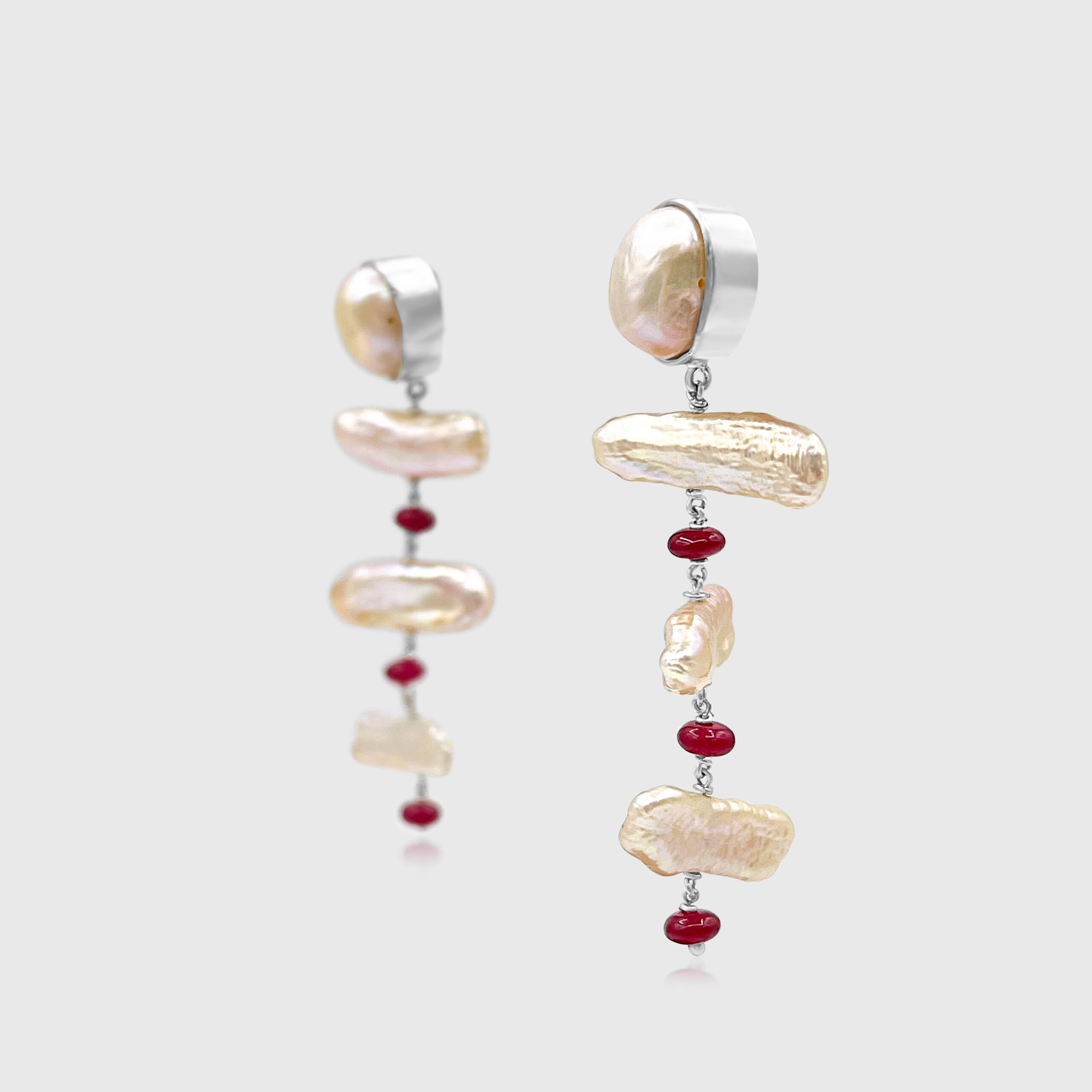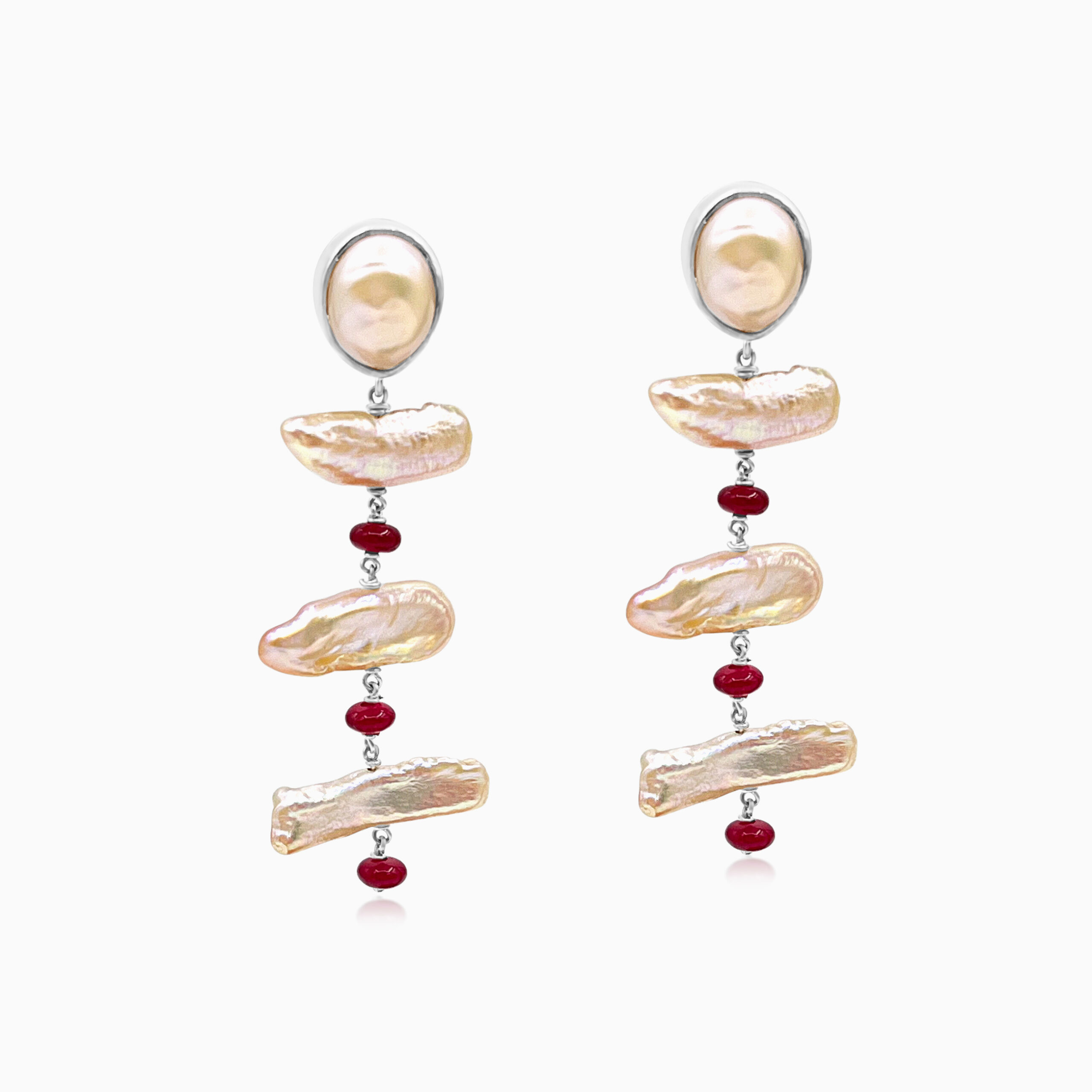 Iridescent freshwater pearls and deep ruby beads cascade in a graceful dance-an exquisite blend of fire and sea.